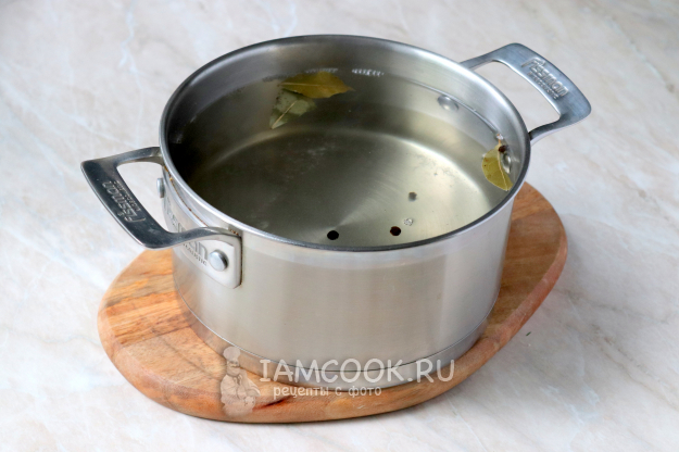 В подходящую кастрюлю налить чистую фильтрованную воду, добавить соль, сахарный песок, чёрный перец и лавровые листы. Отправить варочную ёмкость на огонь и довести до кипения. Проварить до полного растворения кристаллов. После чего влить уксус, перемешать и выключить нагрев.