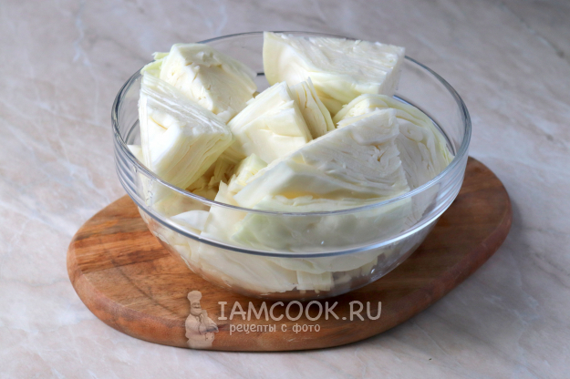 С кочана снять порченые листы, обмыть его и для удобства разрезать на четыре части. Вырезать кочерыжку. Каждую часть разрезать ещё на три части, чтобы получились уголки (как на фото).