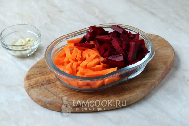 Очистить овощи и чеснок. Свеклу с морковкой нарезать толстыми брусочками. Чеснок - пластинами.