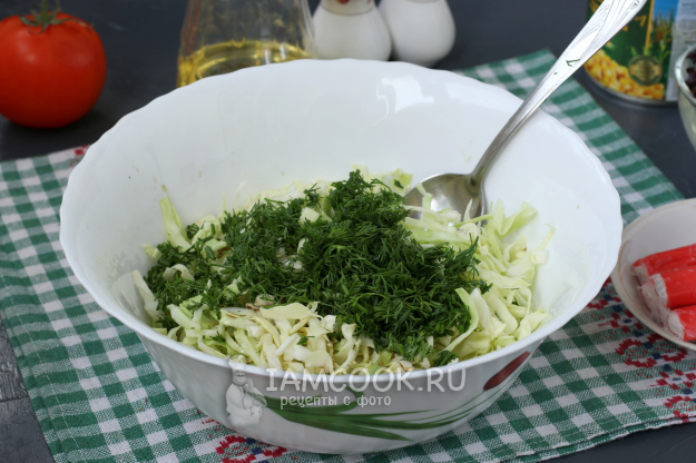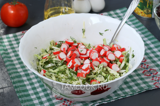 Далее нарезать кружочками крабовые палочки, добавить их к капусте.