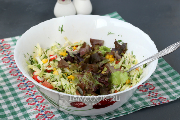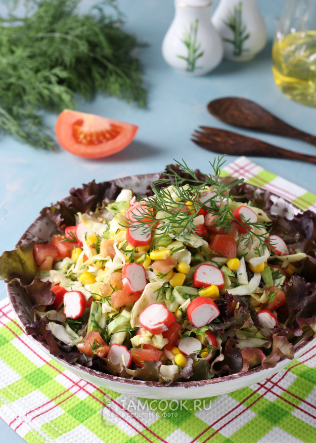Застелить тарелку салатными листьями и выложить на них салат. Всё, салат с крабовыми палочками, капустой, консервированной кукурузой и помидором готов - можно сразу подавать.