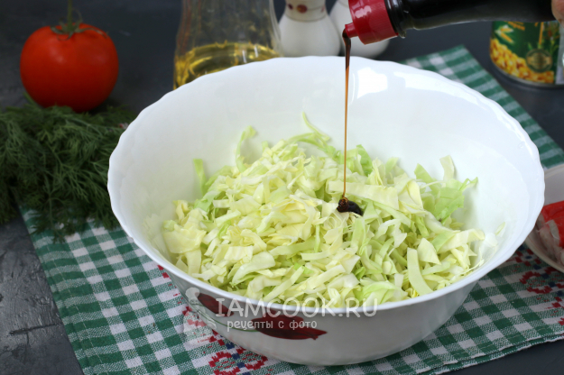 Нашинковать белокочанную капусту, добавить к ней бальзамический соус и перемешать.