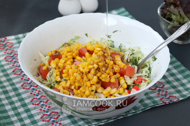 Добавить в салат кукурузу из банки, приправить солью и перцем, полить растительным маслом.