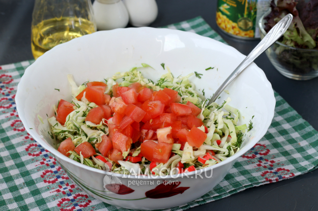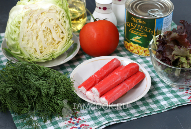 Продукты для приготовления крабового салата с капустой, кукурузой и помидором подготовьте по списку ингредиентов.