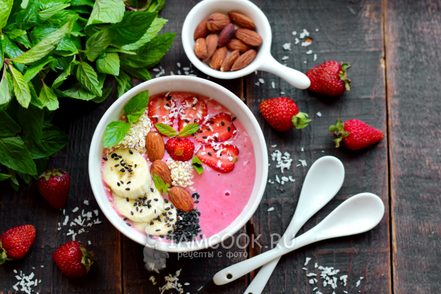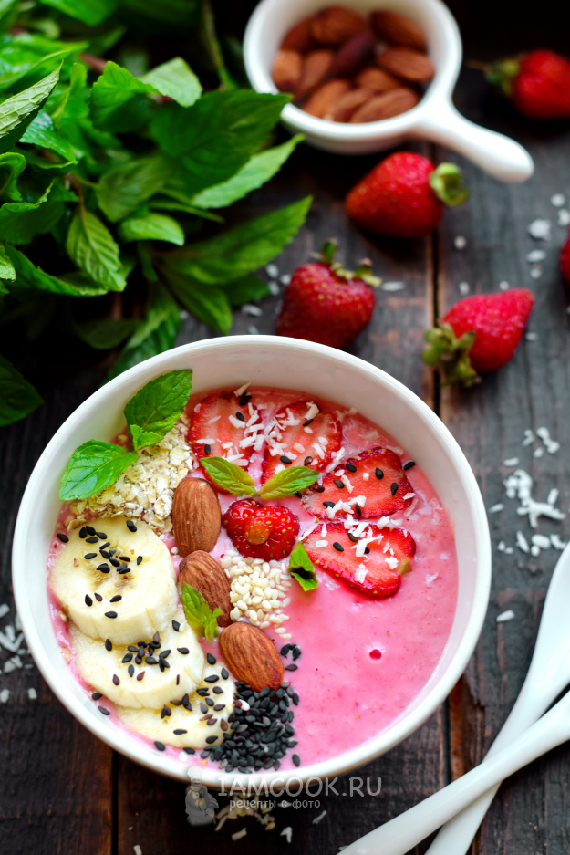 Полученную смесь перелейте в небольшую глубокую тарелку. Сверху на смузи нанесите топпинг — выложите несколько кружков банана и кусочков клубники, добавьте миндальный орех, присыпьте кунжутом и кокосовой стружкой, украсьте свежими веточками мяты. Также можно украсить смузи-боул с клубникой и бананом на своё усмотрение.