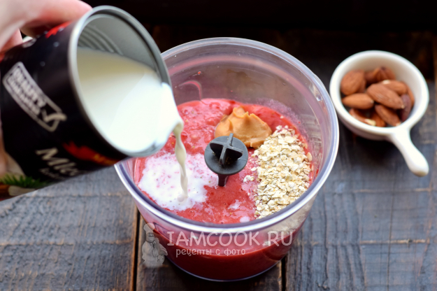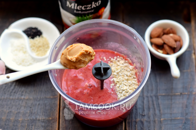 Добавьте арахисовую пасту и овсяные хлопья. Хлопья используйте мелкого помола.
