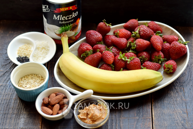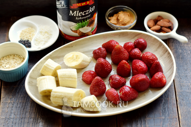 Подготовьте ингредиенты для смузи-боул с клубникой и бананом (а также с овсяными хлопьями и кокосовым молоком).