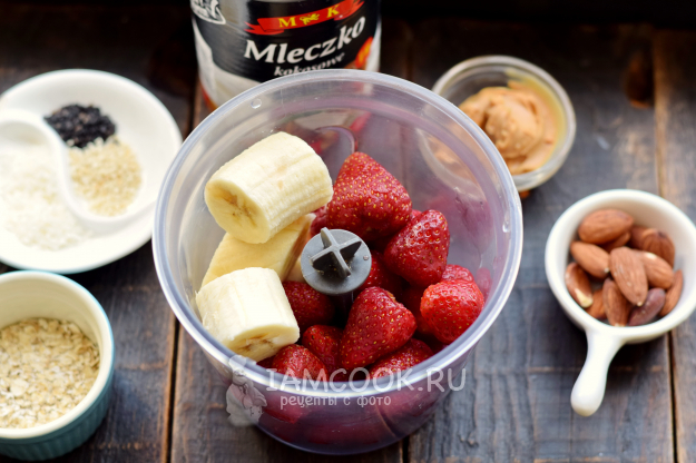 В чашу блендера поместите банан и клубнику. Если емкость небольшая, лучше закладку делать небольшими порциями.
