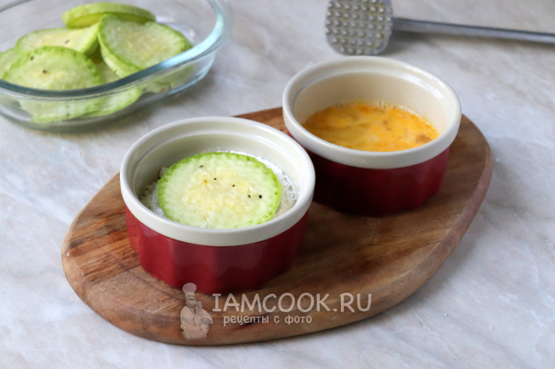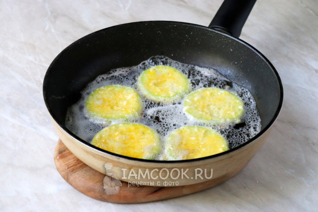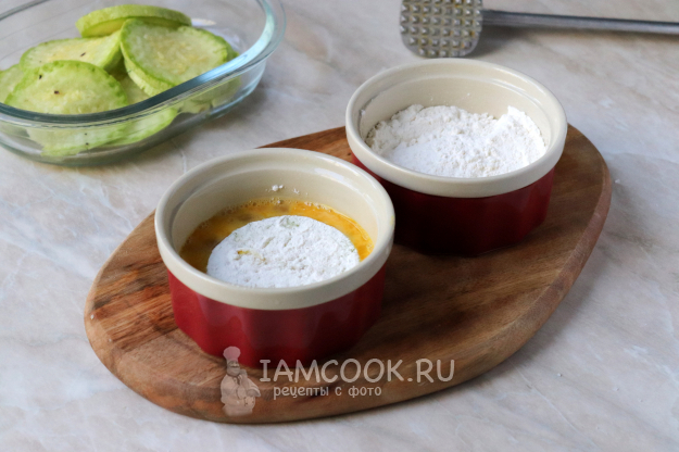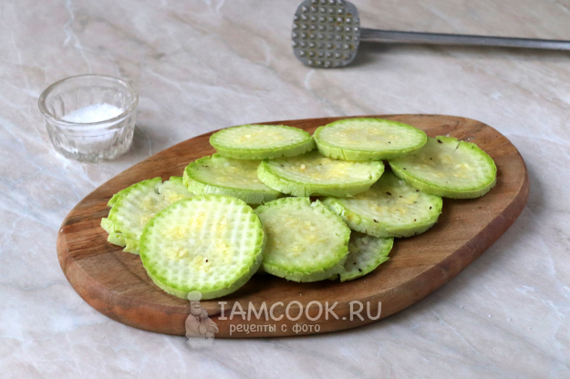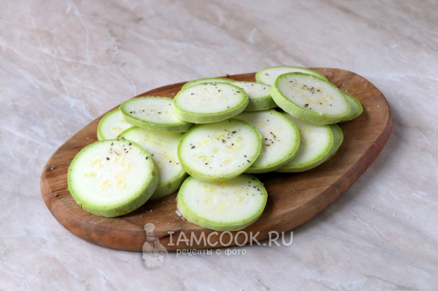 Кабачки нарежьте тонкими кружочками. Если хотите, чтобы отбивные были побольше - режьте наискосок. Посолите и поперчите по вкусу. Перемешайте, чтобы специи равномерно распределились.