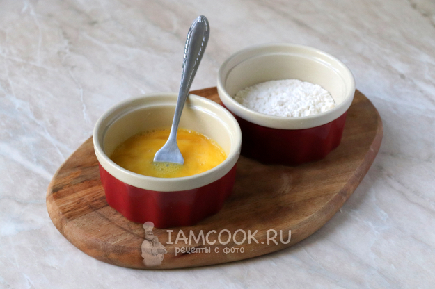 Подготовьте две ёмкости. В одну насыпьте пшеничную муку, а во вторую вбейте куриное яйцо и добавьте щепотку соли. Перемешайте вилкой до однородного состояния.