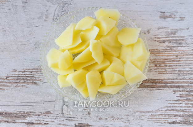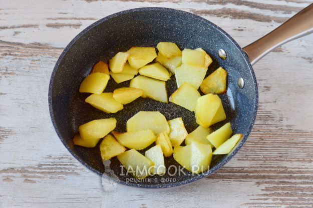 В сковороде разогреем 1 ст.л. масла и обжарим на нём кусочки картофеля минут 5-6, пока они не подрумянятся и не станут мягкими. Переложим готовый картофель в миску.