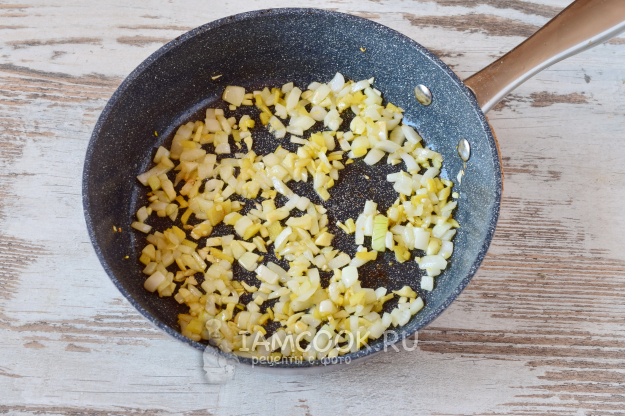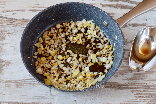 На оставшемся масле обжарим лук, имбирь и чеснок - до прозрачности лука, минуты 4-5, помешивая.
