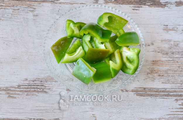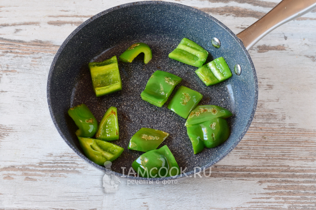 Обжарим перец на сильном огне минуты 4-5, чтобы кожура слегка поджарилась, но сам перец остался твердым.