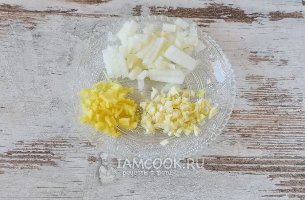 Лук нарежем кубиком, имбирь и чеснок мелко порубим ножом.