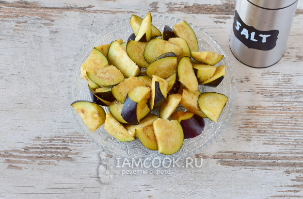 Тем временем, пока жарится картофель, нарежем таким же способом, что и картофель, сам баклажан. Посыплем его солью. Через 5 минут отожмем с кусочков баклажана выделившуюся жидкость.