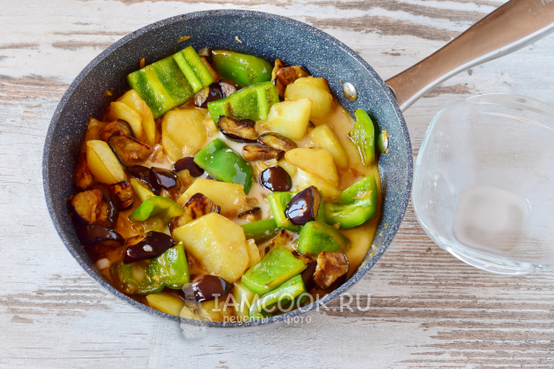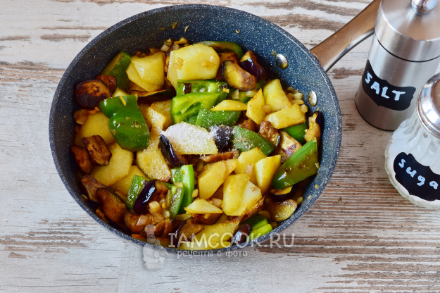 Добавляем в сковороду обжаренные картофель и баклажаны. Добавляем соль и сахар по вкусу.