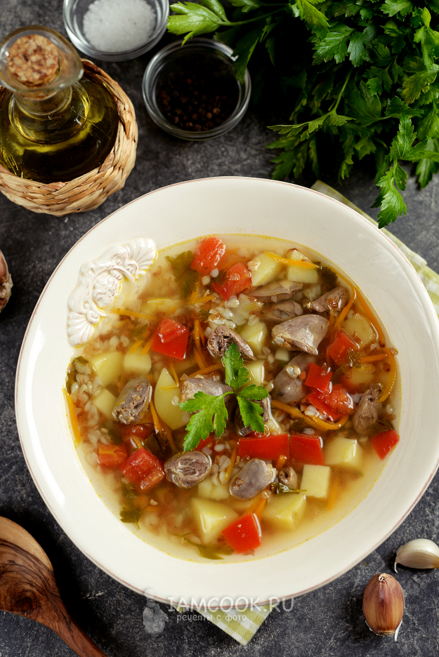 Суп с куриными сердечками и гречкой готов. Вкуснее всего будет, если при подаче положить в тарелку ложку базарной сметаны.