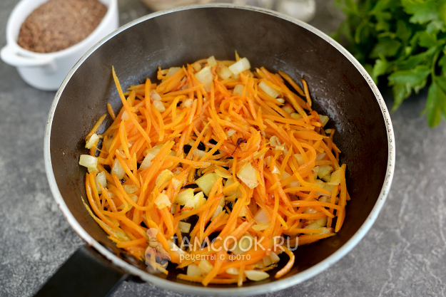 Параллельно разогрейте в сковороде немного рафинированного растительного масла, обжарьте нарезанные лук и морковь до мягкости и сладости, минуты 3-4. Переложите овощи в суп, варите минут 5.