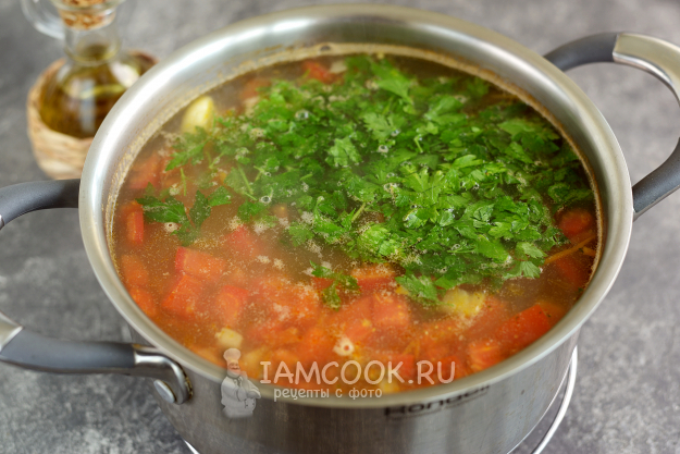 Готовый суп посолите и поперчите по вкусу, при желании можно всыпать любимую универсальную приправу. Порубите крупно любимую свежую зелень, переложите в суп, перемешайте и сразу же выключите плиту. Оставьте суп под крышкой минут на 10-15 настояться. За это время гречка дойдет до готовности и хорошо разбухнет.