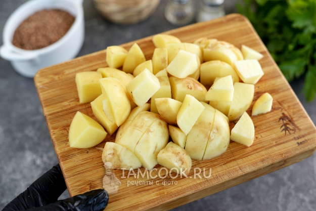 Спустя время добавьте в кастрюлю нарезанный кубиком картофель, варите минут 5-7.