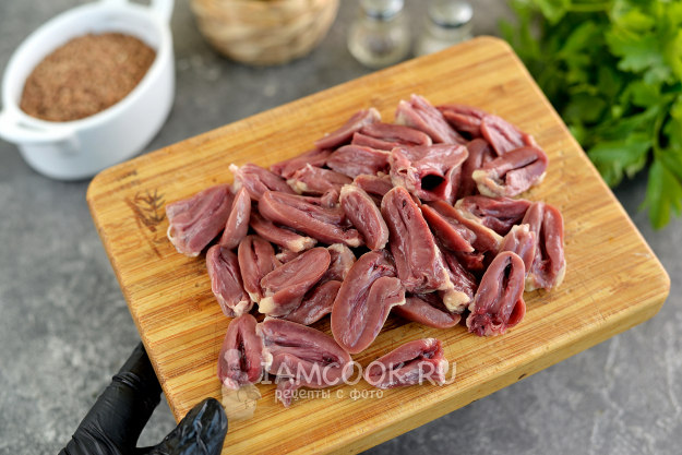 Сердечки помойте под проточной водой, обрежьте капилляры и лишний жир, разрежьте пополам, удалите сгустки крови. Выложите их в кастрюлю с водой, варите на тихом огне минут 15.