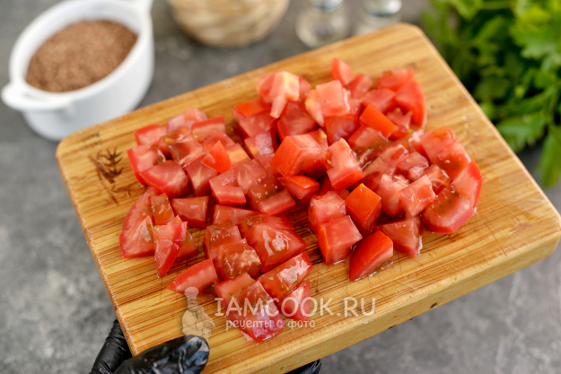 Следующим добавьте нарезанный кубиком спелый и сочный помидор.