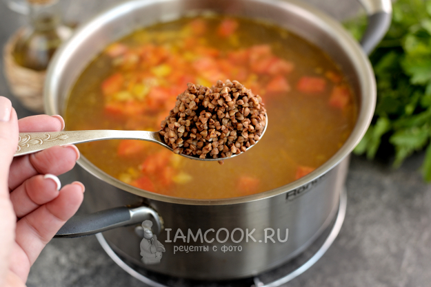 И сразу же всыпьте хорошо промытую гречневую крупу. Варите суп на тихом огне минут 10-12. В процессе положите раздавленный зубчик чеснока и лавровый лист.