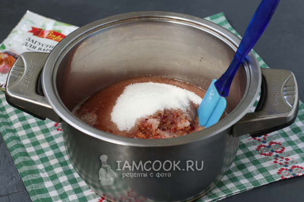 Измельчённую черешню перелить в кастрюлю с толстым дном, добавить сахар и довести до кипения.