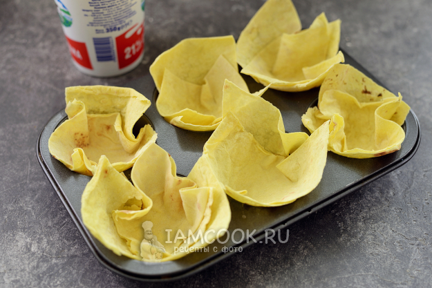Лаваш нарежьте квадратами около 15 сантиметров, выложите по два кусочка лаваша в форму для маффинов.