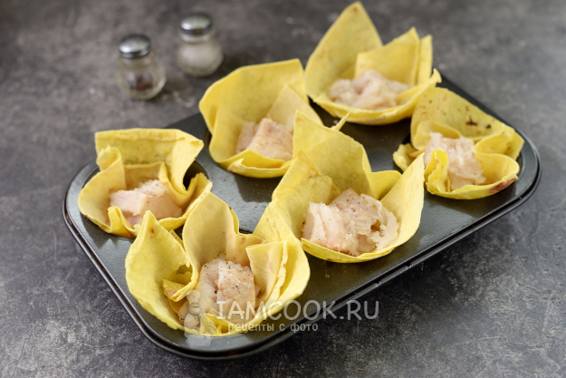 Выложите по несколько кусочков рыбы в каждую порцию лаваша, чуть посолите и поперчите.