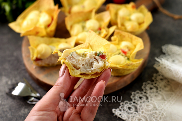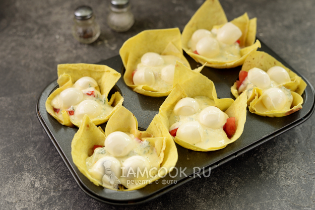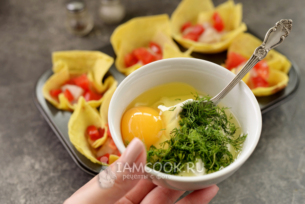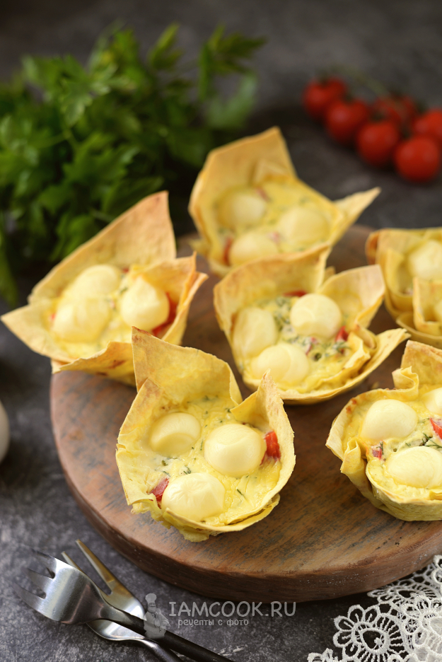 Влейте в каждую корзинку немного приготовленной сметанной заливки, сверху положите нарезанную моцареллу. Отправьте форму в предварительно разогретую до 180 градусов духовку на 25 минут в режиме верхнего и нижнего нагрева.