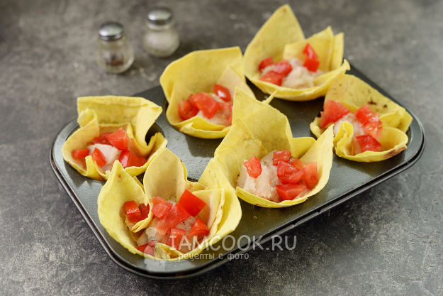 Помидор очистите от семечек, нарежьте филе мелким кубиком. Немного помидора также положите в каждую порцию.