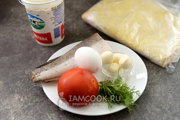 Возьмите продукты для приготовления корзиночек из хека в лаваше в духовке. Помидор и укроп помойте, обсушите.