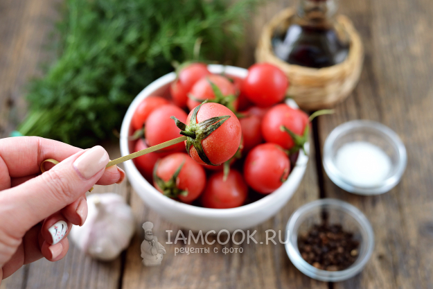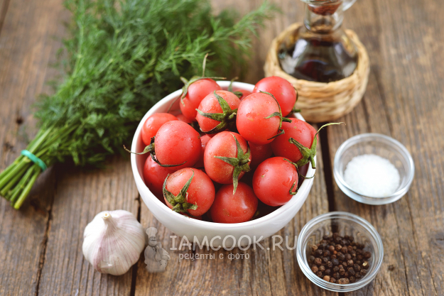 Возьмите необходимые продукты для приготовления малосольных помидоров черри в пакете (с чесноком). Помидоры и укроп помойте. Если помидор совсем меленький, его можно оставить с хвостиком, так готовая закуска будет выглядеть гораздо симпатичнее.