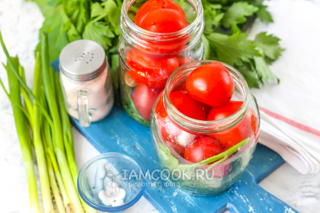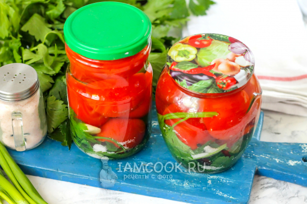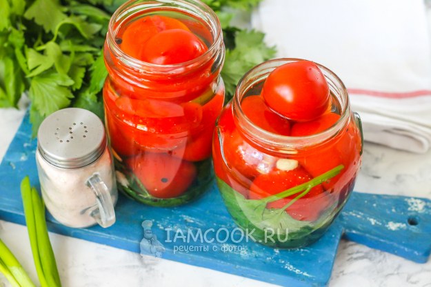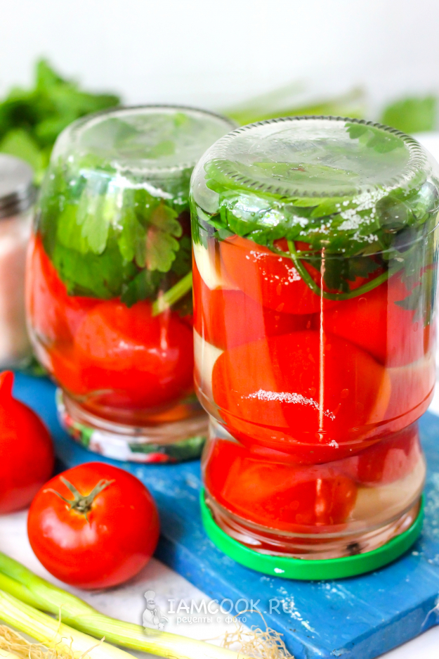 Промойте помидоры и заполните ими банки доверху. Вскипятите воду и залейте кипятком томаты в банке, выдержите примерно 10-15 минут, закрутив крышки. Затем слейте воду из банок.