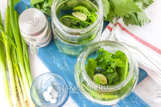 Промойте банки и стебли сельдерея. Очистите чеснок от шелухи и также промойте. Уложите стебли сельдерея в банки и нарежьте туда чесночные зубчики.