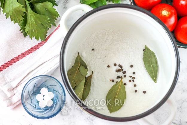 Всыпьте в кастрюлю соль, сахар, лавровые листья и горошины черного перца.