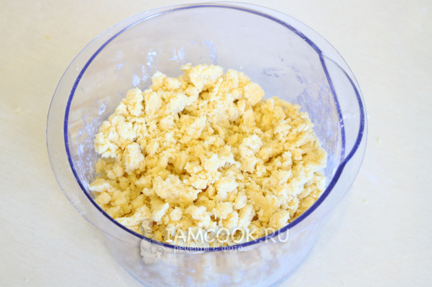 Руками перетрём ингредиенты в крошку до их соединения друг с другом. На это уйдёт буквально 5 минут.