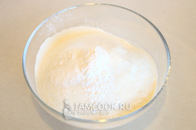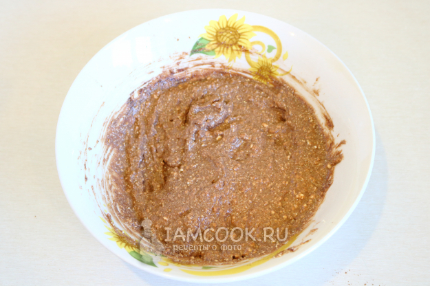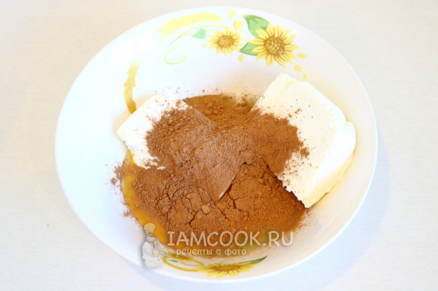 В миске соединим творог, яйцо, сахар и какао.