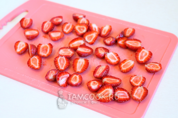 Клубнику промоем, очистим от хвостиков, просушим и нарежем на половинки.