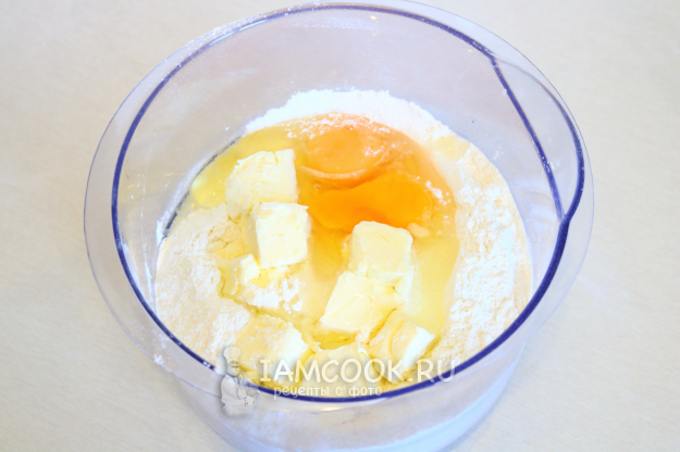 Добавим в миску кусочки мягкого сливочного масла (размягчённого при комнатной температуре) и яйца.