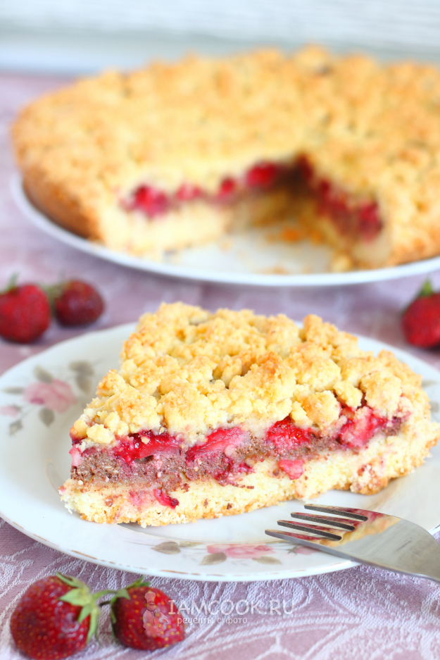 Выпекать сбричолату с творогом и клубникой будем при 180 градусах до румяности (40-45 минут). Готовый пирог необходимо полностью остудить в форме.