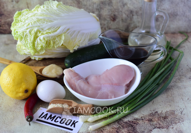 Для приготовления японского салата «Киото» очень удобно заранее подготовить все продукты: ополоснуть перья зеленого лука, тщательно вымыть огурчик, листья пекинской капусты, помыть куриное филе в проточной воде, почистить и помыть поверхность свежего лимона.