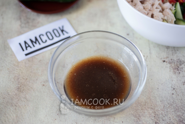 В отдельной миске соединить ингредиенты для салатной заправки: соевый соус (3 ст.л.), оливковое масло (2 ст.л.), мед, лимонный сок (2 ч.л.). Перемешать до равномерного распределения ингредиентов в смеси.