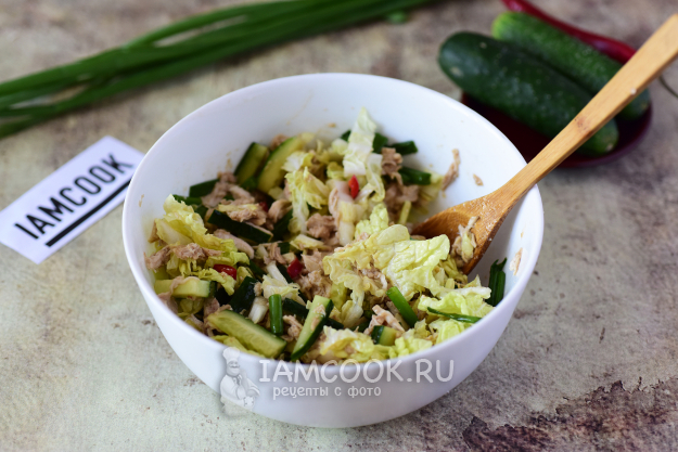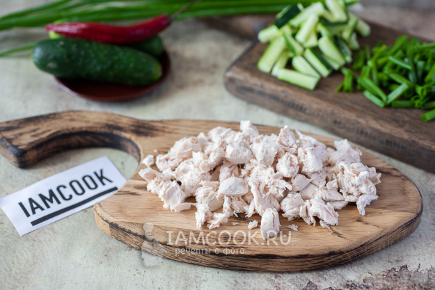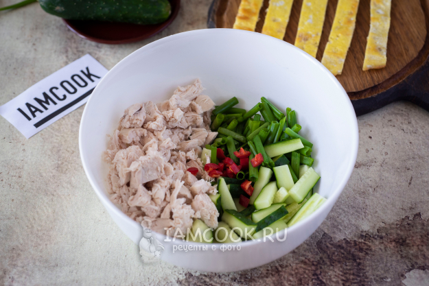 Отрезать четвертую часть небольшого стручка перчика чили, очистив от семян, мелко нашинковать. В просторную салатную миску выложить измельченные лук, огурец, куриное филе, перчик чили.