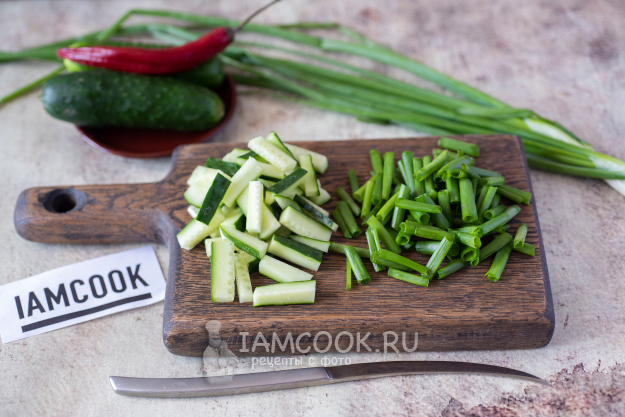 Небольшими тонкими брусочками порезать огурец и зеленый лук.