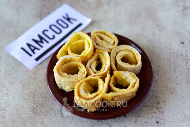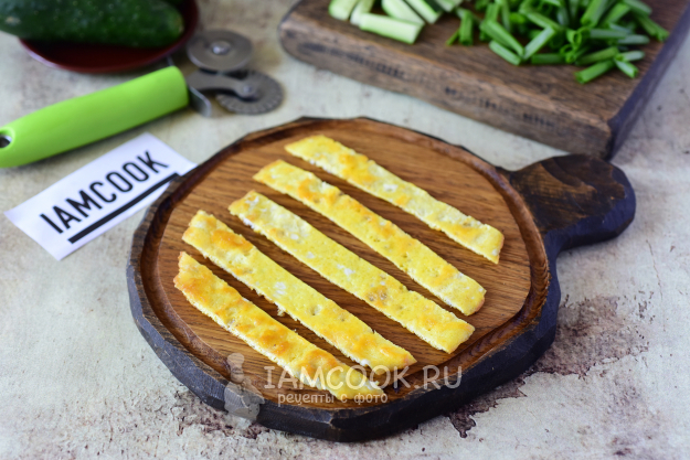 Уже остывший омлет можно порезать тонкими полосками шириной примерно в 1,5 см, отставить в сторону 5-6 минут полежать.