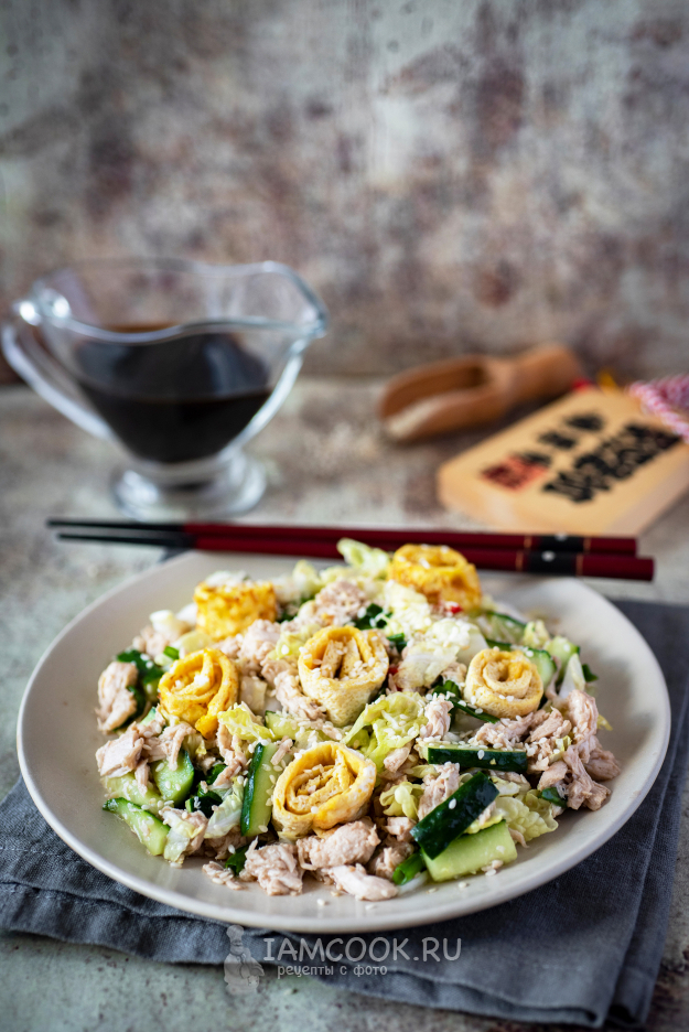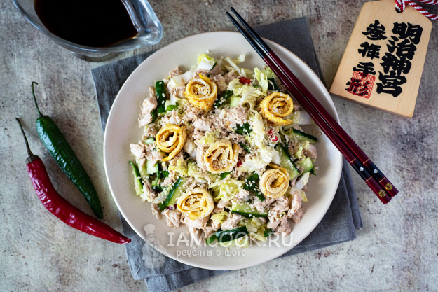 На плоскую тарелку выложить готовый салат «Киото», по поверхности которого распределить омлетные рулетики, посыпать кунжутом, подать к столу.
