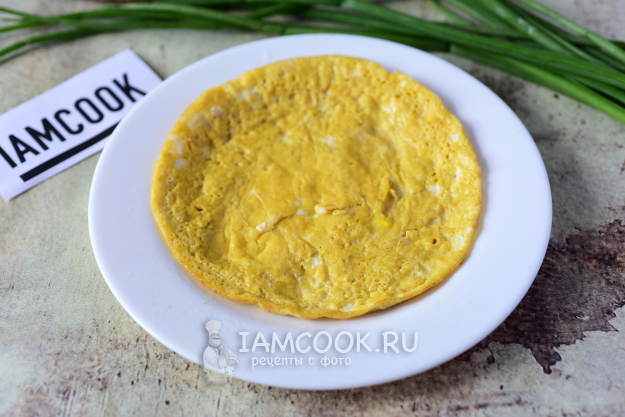 В сковороде на среднем огне разогреть ложку оливкового масла и залить омлетную смесь. Через 6-7 минут омлет готов. Выложить его на тарелку охлаждаться.