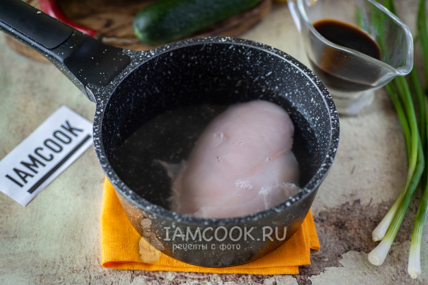 В сотейник залить литр воды, выложить подготовленное филе и поставить на плиту, включив огонь чуть меньше среднего. Примерно через 35-40 минут с момента начала кипения жидкости сотейник можно снимать с плиты - филе готово.